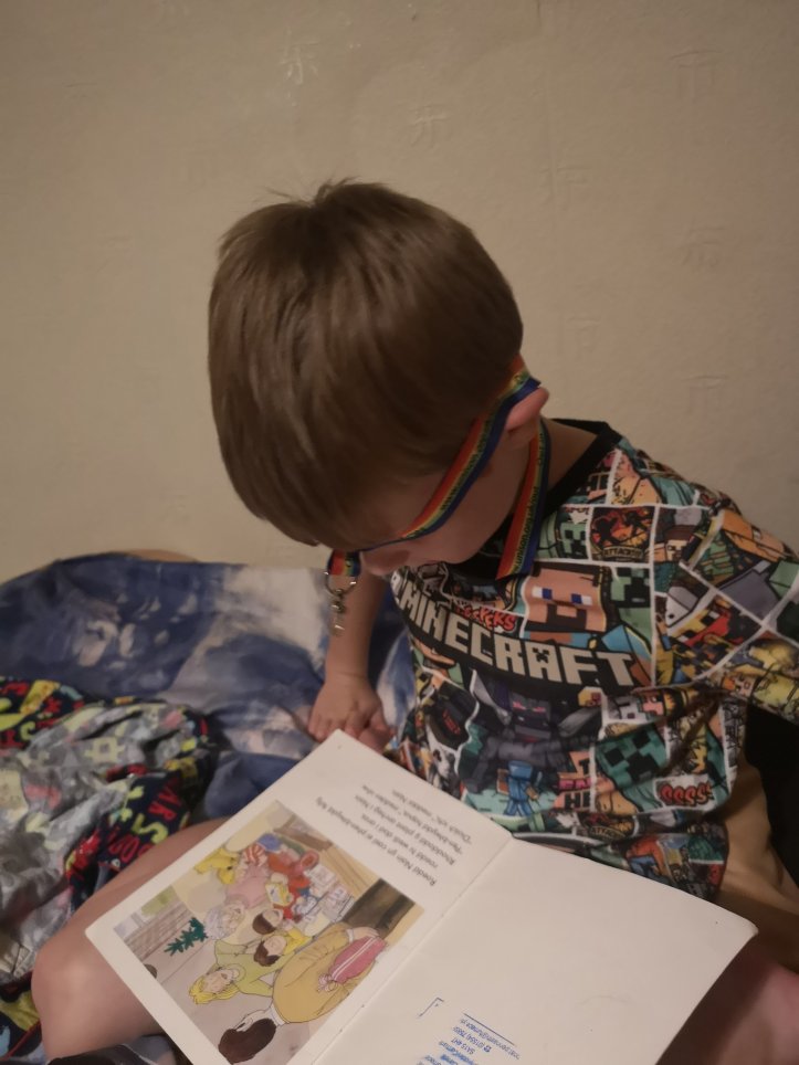 Big little reading his school book before bed. He’s in a Welsh school so all his books are Welsh at the moment.